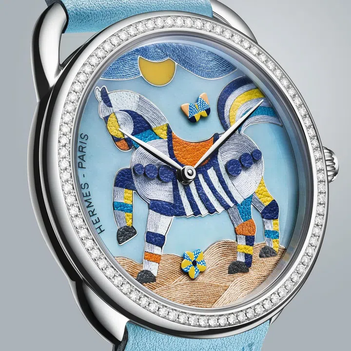 Her second silk thread masterpiece is the new Arceau Mon Premier Galop, which has an even more complex production process. The galloping horse motif is more intricate, while the dial had to be accomplished jointly with a leather marquetry artisan from Hermes’ workshop.