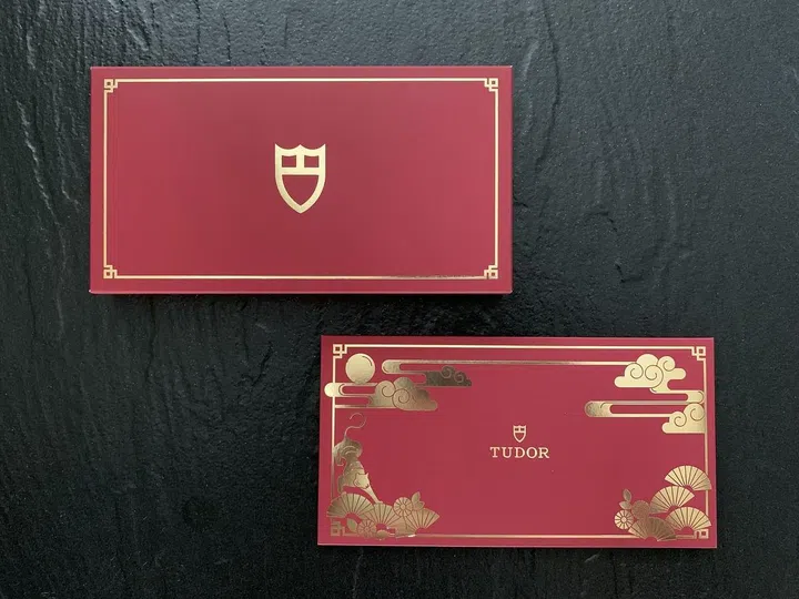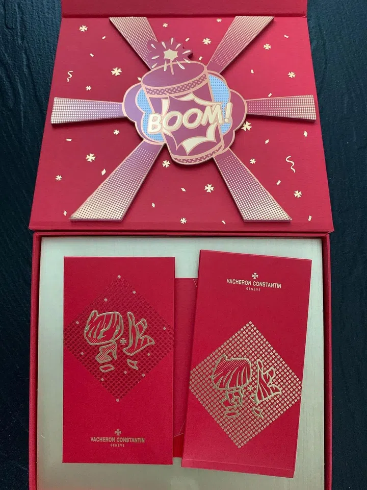 Presented in a festive box that recalls its recent Pop Art campaign, Vacheron Constantin's ang pows feature the Chinese word fu (fortune) against a backdrop made up of its signature Maltese cross.