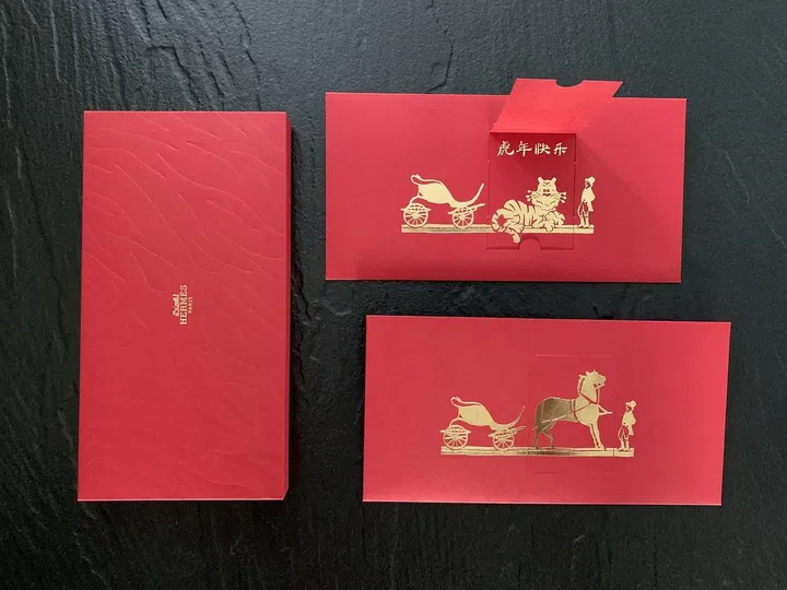 Hermes can always be counted on for delightful surprises. Its 2022 ang pow features the brand's horse carriage logo, but lift a flap and you'll find a grinning tiger instead.