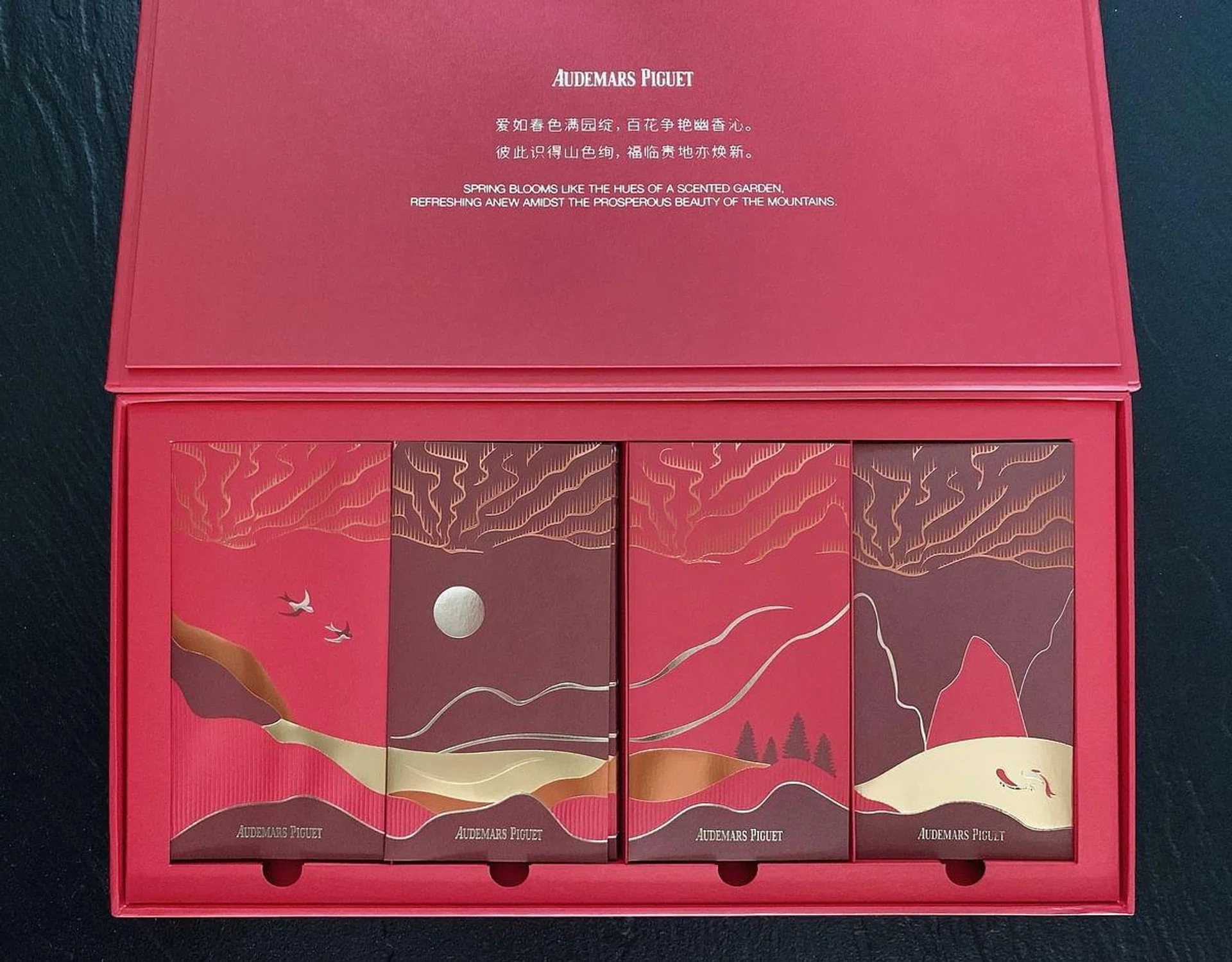 Reminiscent of the tableaus on their enamelled timepieces, delicate flora and fauna decorate Patek Philippe's red packets for this year.