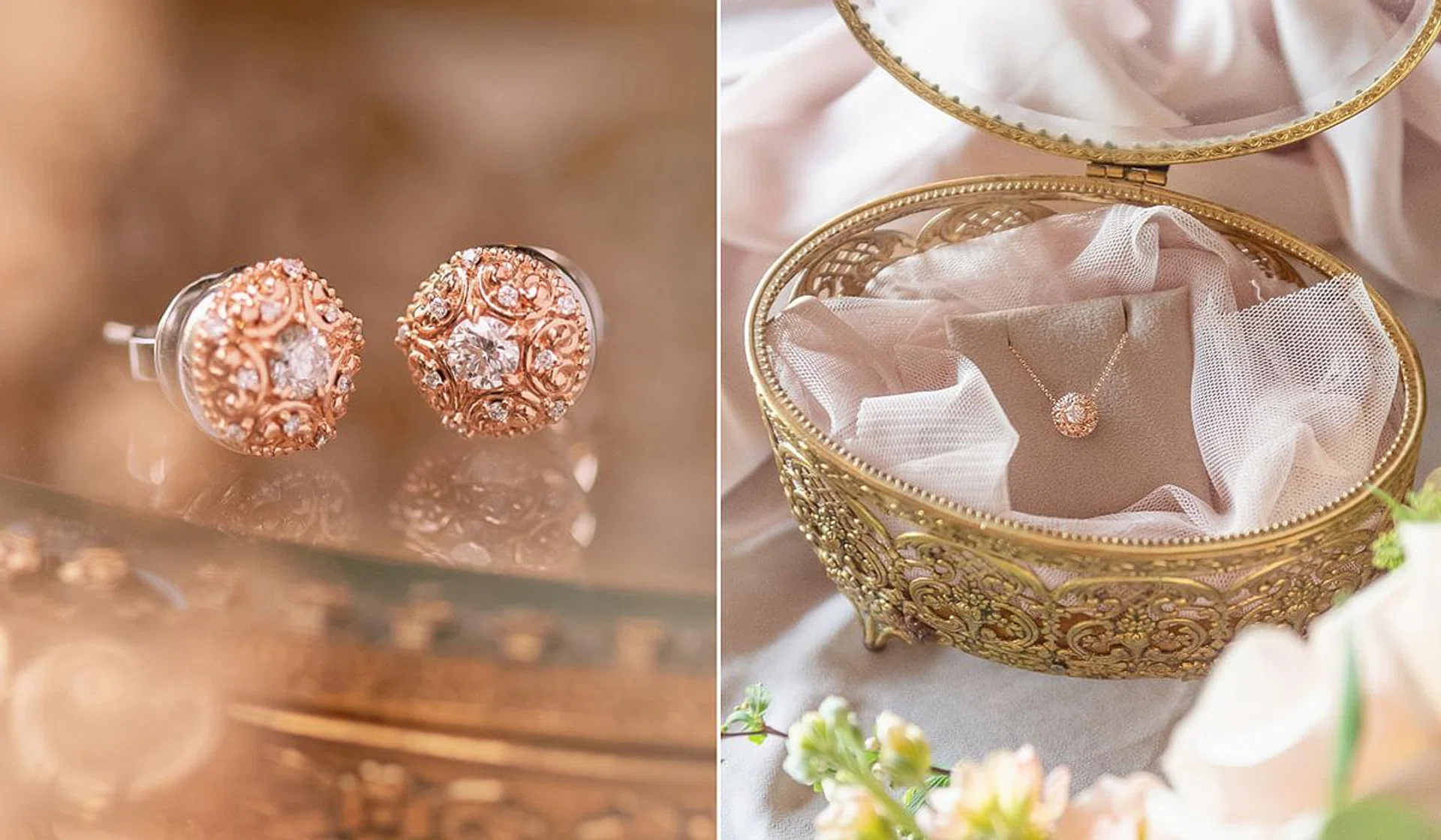 The central motif marries an elegant dome with subtle Milgrain detailing, crafted with diamonds and either a combination of 18K rose and white gold, or full 18K rose gold.