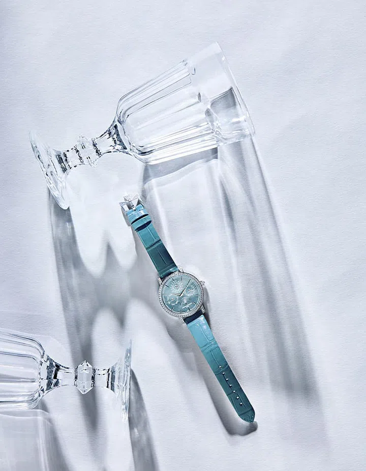Melding horological complexity with elegant sleekness, the Vacheron Constantin Traditionnelle Perpetual Calendar Ultra-thin is powered by the ultra-thin in-house calibre 1120 QP. Cased in white gold, the 36.5mm watch features a shimmering blue-grey mother of pearl dial that is framed by a gem-set bezel.