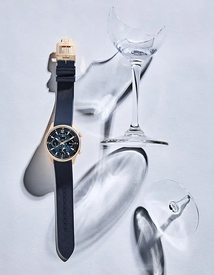 Housed in a 42mm pink gold case, the Polaris Perpetual Calendar by Jaeger-LeCoultre presents the perpetual calendar complication in a sporty package. Four subdials show all the calendar indications — year, month, day, date and moon phases. Especially of note is the lunar indicator, where the main display reflects the moon phase in the Northern Hemisphere while a retrograde hand shows that in the Southern Hemisphere.