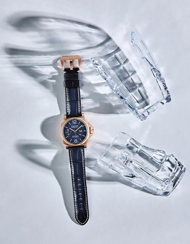 Tracking the date, day, week, month and years automatically until the year 2100 if kept wound, perpetual calendar wristwatches typically have busy dials. Not the Luminor Perpetual Calendar, which boasts the legibility synonymous with Panerai timepieces. It shows the day and date indications on the front, and tucks away the other calendar displays on the back. The self-winding watch is housed in a 44mm Goldtech case.