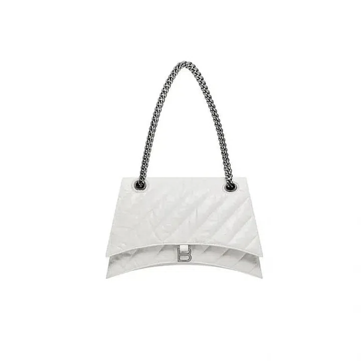 The now-classic Balenciaga hourglass bag, which launched in 2019, gets a larger, softer reiteration in the Crush Bag. First appearing on the Winter 2022 runway, the Crush Bag follows its predecessor in curved base, but is purposely deconstructed, with visible scrunches along the bag’s smooth leather material that resemble crumpled paper. Its rustic metal chain (available in both gold and silver hardware) can be adjusted to be worn long or short. The Crush Bag is available in black, white, sweet pink, bright green, and metallic silver, in small, medium, or large sizes.