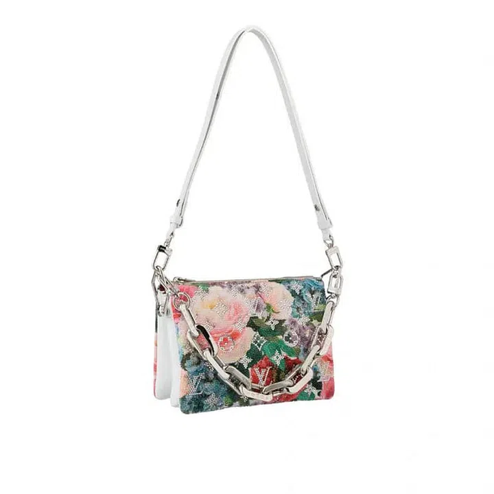Released during the Spring 2021 season, Louis Vuitton’s Coussin BB bag was a fun addition to the French Maison’s bag lineup – a padded, accordion-style bag with a texture that takes after its name (coussin translates to “cushion” in English). Flash forward to Fall/Winter 2022, and the latest iteration of the Coussin BB comes in an eclectic and vibrant array of colours and patterns, like this floral-print and white design: a monogram blankets the Coussin, outlined using Swarovski crystals. The Coussin BB is available in stores and online.