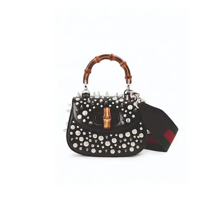 Seventy-five years after its original debut, the Gucci Bamboo bag is sporting its most rock ‘n’ roll version yet. For the Exquisite Gucci collection, it gets a re-release with punked-up versions that include an all-black smooth bamboo handle and a studded bodice with “GUCCI” lettering in metallic beads. The bag is available in small and medium sizes, with a detachable strap.