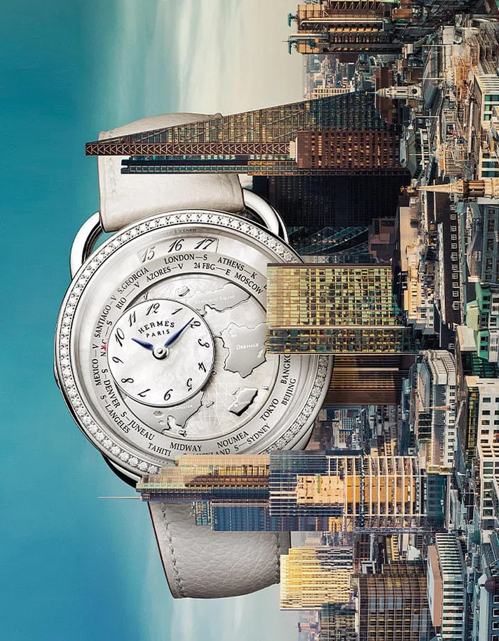 The latest edition of the self-winding Arceau Le Temps Voyageur watch by Hermès features a rhodium-plated dial with a mother-of-pearl counter. Set with 78 diamonds, the 38mm steel timepiece has a mobile hours-and-minutes subdial that can be advanced by a pusher at 9 o’clock. As it moves to one of the 24 time zones represented by the cities on the world-time flange, the time shown on the subdial also changes accordingly.