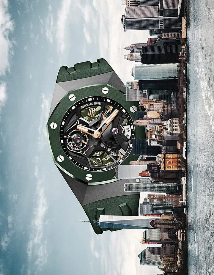 The Royal Oak Concept Flying Tourbillon GMT 44mm by Audemars Piguet now comes with a new look. For the first time, the architectural-looking model is topped with a green ceramic bezel, which is matched with the movement’s green CVD-coloured inserts. Powered by the manually wound Calibre 2954, the titanium timepiece combines a flying tourbillon with a second time zone indicator at 3 o’clock.