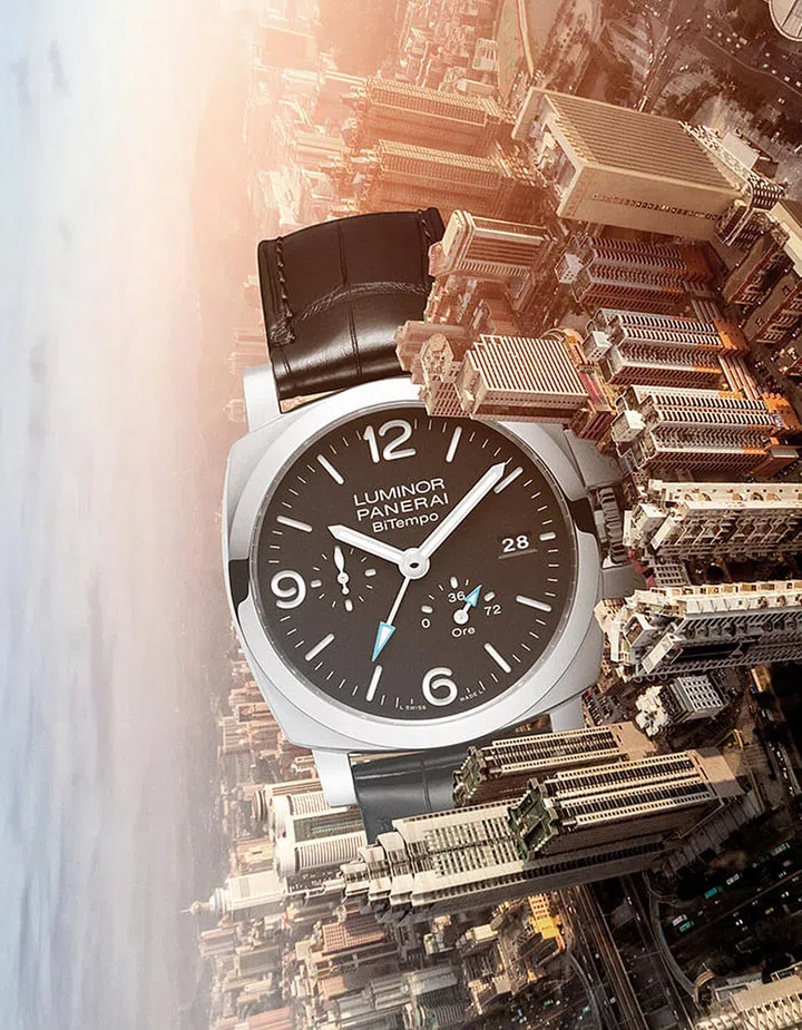 Panerai’s latest dual-time watch reminds users of the brand’s Italian origins with its moniker BiTempo (tempo means time in Italian), as well as the use of the word “Ore” (hours) at its power-reserve display. But you can travel anywhere in the world to appreciate the ease of reading the second time zone indicated by the blue-tipped GMT hand of the Panerai Luminor BiTempo, a 44mm automatic watch in steel.