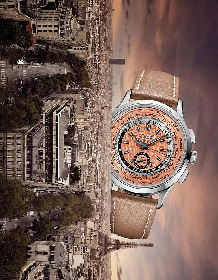 A highlight among Patek Philippe’s recently revealed eight new watches, the Ref. 5935A World Time Flyback Chronograph is the first stainless steel version of a Patek Philippe model combining a self-winding flyback chronograph and the world-time function. The increased case diameter of 41mm from 39.5mm gives the 24-time-zone display more space and greater legibility.