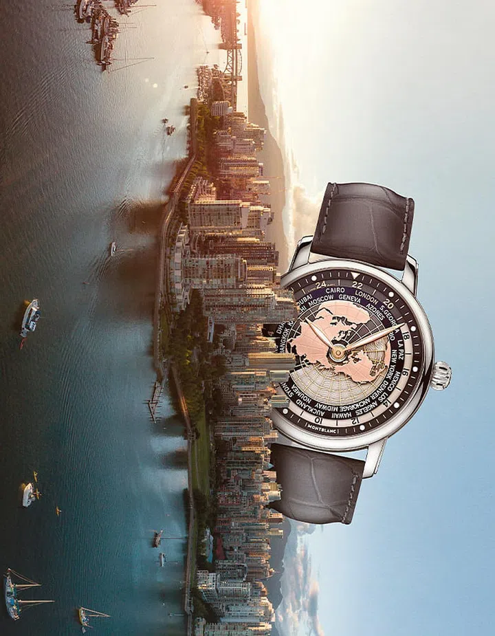 Named after a world map created by Roman general Marcus Vipsanius Agrippa in the first century AD, the Montblanc Orbis Terrarum features a world-time display that simultaneously shows the time in 24 time zones. The 43mm steel watch features a rose gold-coated cut-out of the continents, while a guilloché-patterned disc beneath it features dark and light shades of grey to indicate night and day in different parts of the world.