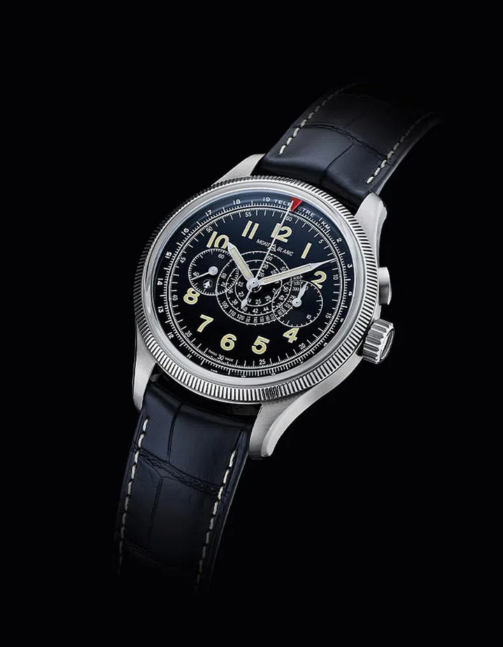 In the ‘20s and ‘30s, the Minerva watch manufacture, now known as Villeret and owned by Montblanc, was producing professional chronographs for the burgeoning aviation industry. Montblanc pays homage to some of those early pilots’ watches with the 1858 Minerva Monopusher Chronograph Red Arrow, a 42mm steel timepiece combining a fluted bidirectional bezel and a red arrow — key elements of those models — and the in-house calibre M13.21.