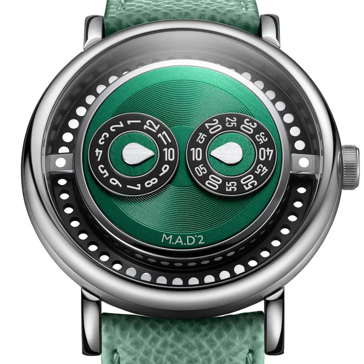 In the entry-to-mid-luxury tier, M.A.D. Editions’ M.A.D.2 Green stands out for its playful spirit and accessible price. Created by long-time independent watchmaker Max Busser and designed by Eric Giroud, the 42mm steel piece draws inspiration from 1990s club culture and turntable aesthetics, with twin rotating cylinders for hour and minute display, a crown at 12 o’clock, and a visual nod to DJ mixers.