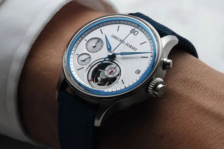 Housed in a compact 37.9mm white gold case, the movement integrates the foudroyante mechanism directly into Greubel Forsey’s first flying tourbillon. The display divides each second into six segments, with the foudroyante hand rotating once per second while remaining perfectly oriented, regardless of the tourbillon’s rotation. A redesigned rhodium-finished dial, blued hands, and a textured blue rubber strap further distinguish this evolution from the earlier EWT prototype.
