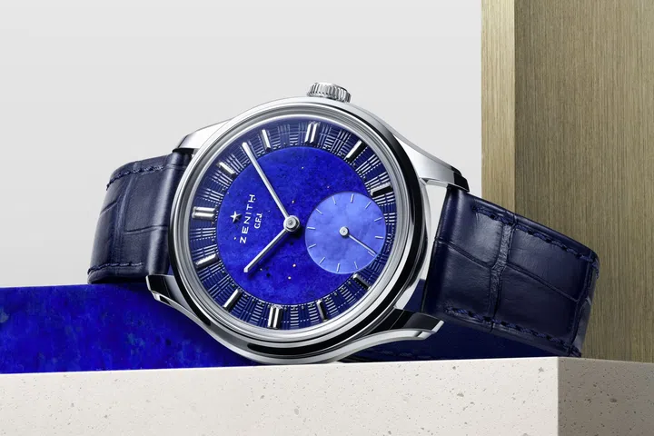 Aesthetically, the watch is equally compelling. The 39mm platinum case features sculpted, stepped lugs, and alternating finishes, while the dial layers together a brick-pattern guilloche ring, a deep blue lapis lazuli centre flecked with golden pyrite, and a mother-of-pearl small-seconds sub-dial. This composition evokes both Zenith’s celestial heritage and the architecture of its historic manufacture. And the watch is released in only 160 pieces.