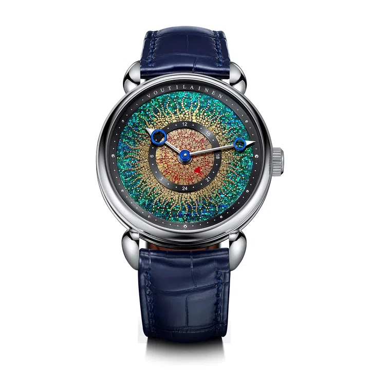 A marriage of Japanese lacquer mastery and Swiss high horology, this 39mm beauty from Finnish watchmaker Kari Voutilainen showcases a dial crafted using Urushi lacquer, gold powders, cut gold sheets, and abalone shell — a process demanding over a thousand hours of work. Inspired by natural dualities, its design reflects “soyou” with a blue-green outer ring symbolising water and calm, contrasted with a radiant gold-red centre representing light and creative energy.