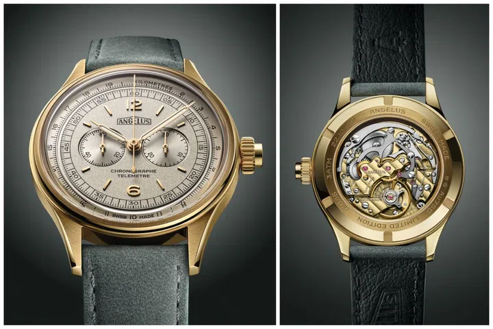 The defining feature of the telemeter scale offers a nod to historic chronograph instrumentation, used to determine an event’s distance by measuring the time between seeing it and hearing it. Inside, the in-house A5000 calibre underscores Angelus’ technical credentials, combining a column-wheel mechanism, horizontal clutch, two-register layout, and a 42-hour power reserve. Its two-tone finishing, diamond-polished details, and pronounced bevelling elevate the movement into a true aesthetic highlight.