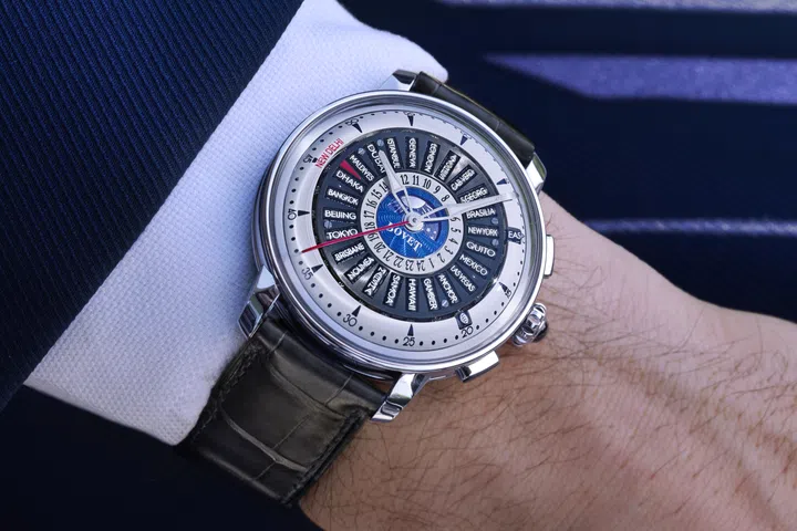 Dominating the dial, the rollers offer exceptional legibility, while the central day-night indicator provides immediate geographic context. For India-based collectors, an alternative version links the main hour and minute hands directly to New Delhi time. Produced fully in-house for the first time, the 42mm case in a choice of red gold or Grade 5 titanium features a domed sapphire crystal designed to evoke a window to the universe.