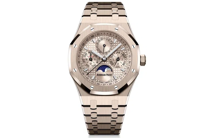 Audemars Piguet celebrates its 150th anniversary with a bold new milestone in its most recognisable collection. The Royal Oak Selfwinding Perpetual Calendar in Sand Gold elevates the brand’s icon with a new alloy combining gold, palladium, and copper that yields a warm, shifting hue that oscillates effortlessly between white and rose tones. Its monochrome aesthetic extends across the 41mm case, bracelet, Grande Tapisserie dial and counters, imbuing the model with remarkable visual cohesion.