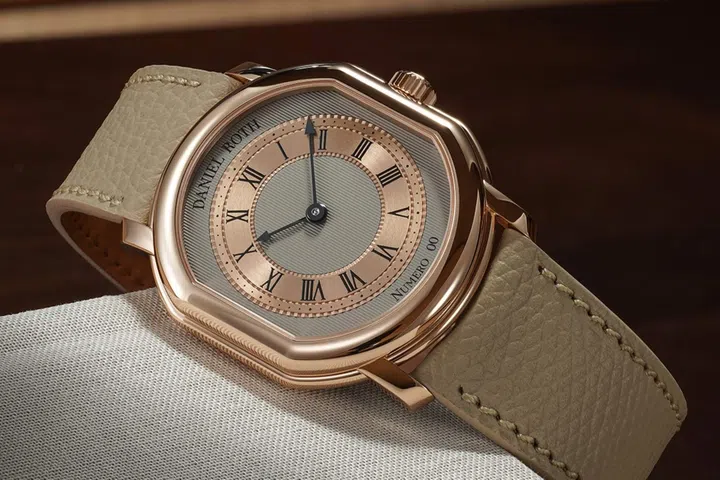 The revival of Daniel Roth continues with the elegant Extra Plat Rose Gold, a refined evolution of the brand’s signature double-ellipse silhouette. The rose gold case measures 38.6mm by 35.5mm with a remarkably slim 7.7mm profile, complemented by soft, downward-curving lugs soldered by hand — a testament to traditional case-making. The two-tone dial combines a solid white gold base with a rose gold chapter ring, decorated with meticulous pinstripe guilloche that highlight the brand’s artisanal DNA.