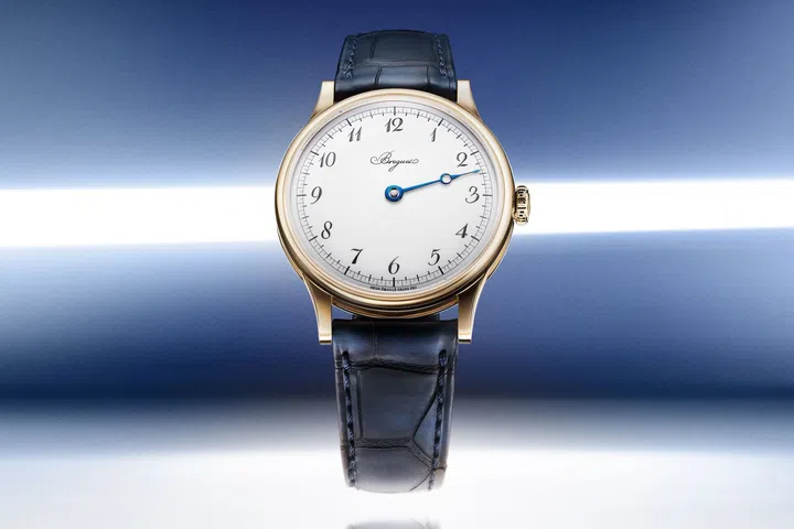 Reinterpreted as a modern 40mm wristwatch, the piece is crafted in a new proprietary alloy known as Breguet gold, a warm and subtly pink metal inspired by the gold used in historic pieces. Its aesthetic restraint is anchored by a pristine grand feu enamel dial, petite-feu numerals, a flame-blued hand and the maison’s secret signature, engraved with an 18th-century diamond-tipped pantograph newly restored by the brand.