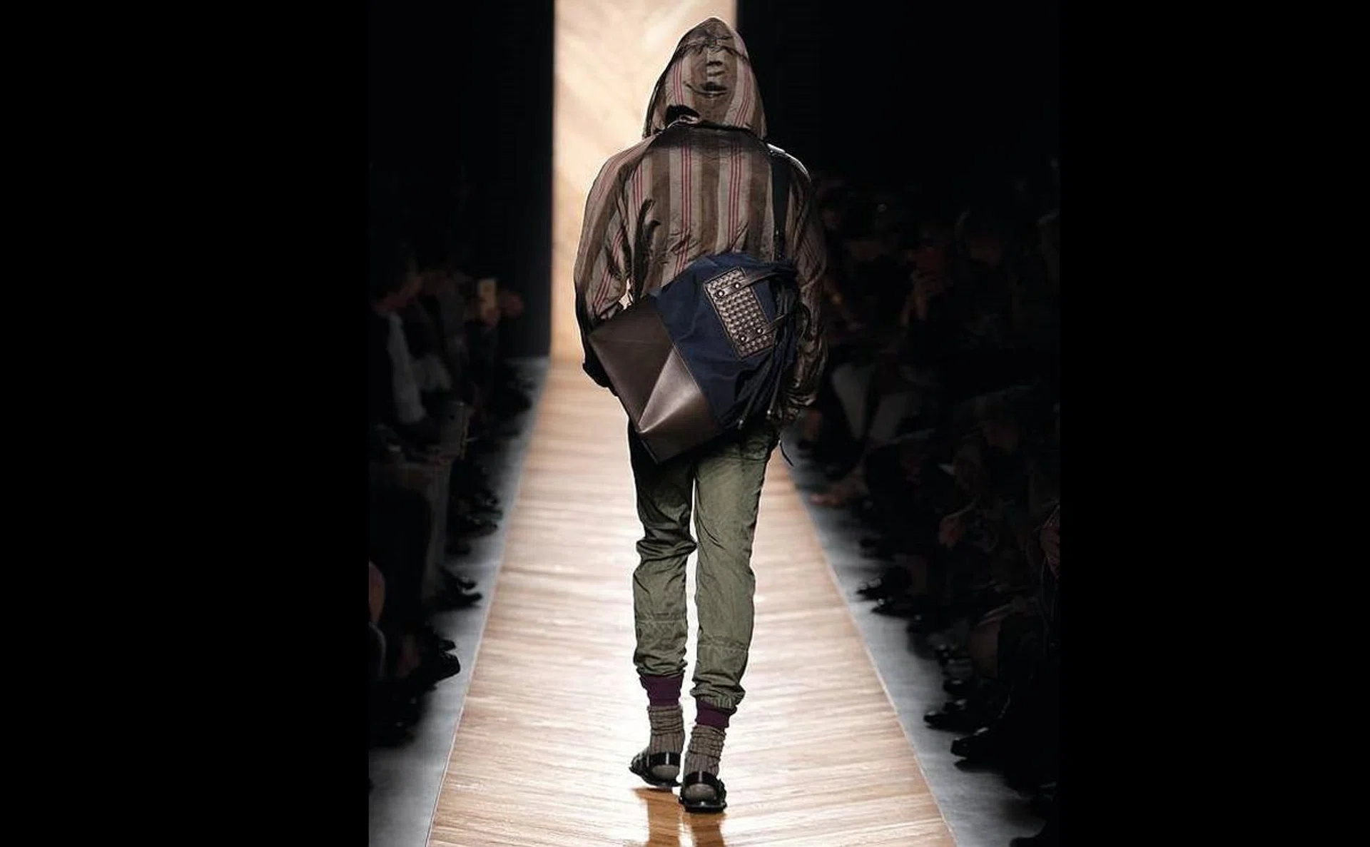 Material-wise, slouchy technical canvas is juxtaposed against a reinforced base of matte calf leather, while woven intrecciato leather accents add a subtle, distinctive flourish.