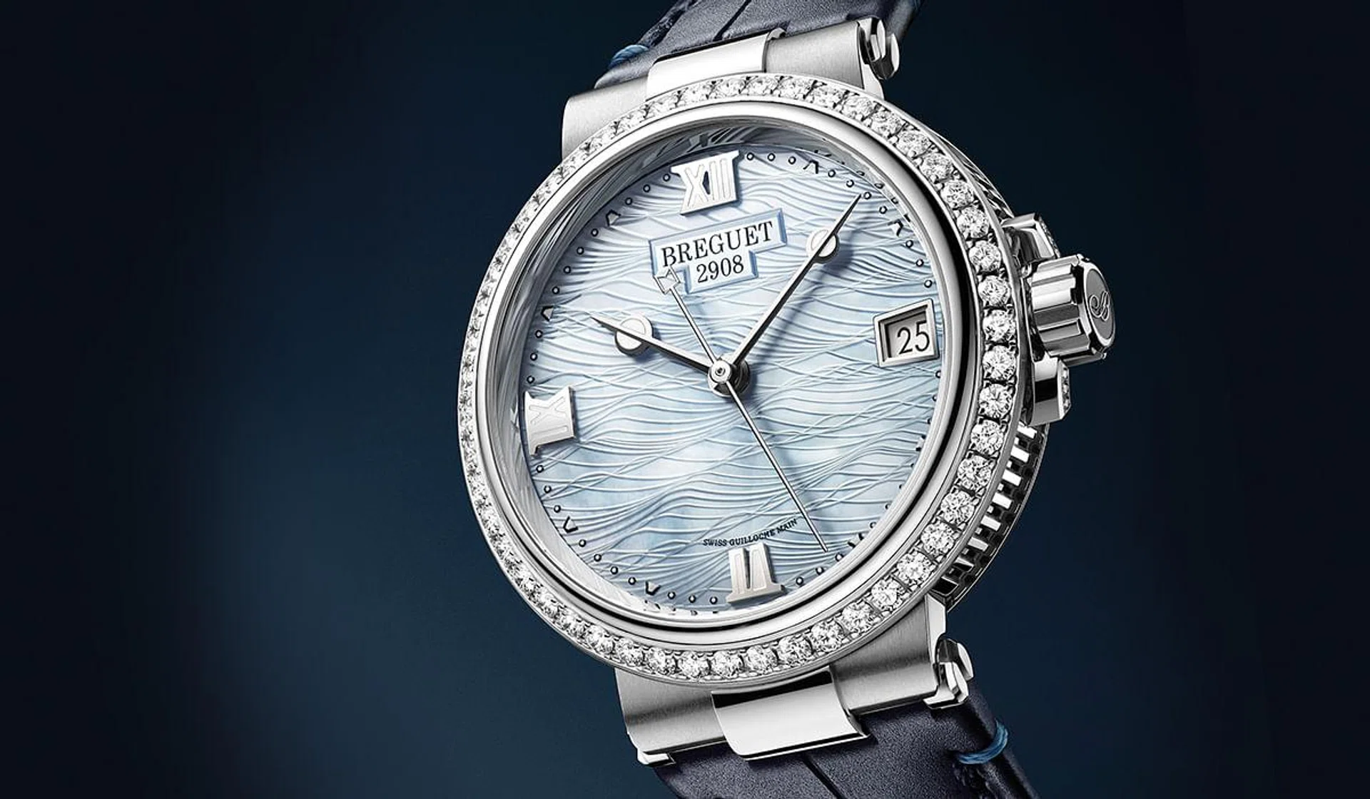 In the rose and white gold versions, adorned with 50 brilliant-cut diamonds on their bezels, the motif on their light-blue or opaline dials (depending on the version) is engraved with a guilloche technique unique to Breguet that provides a 3-D effect. The steel versions showcase dials in either natural opaline mother-of-pearl or marbled, dark blue lacquer, which respectively represent the shimmering reflection of sunlight or starlight on the ocean waves.