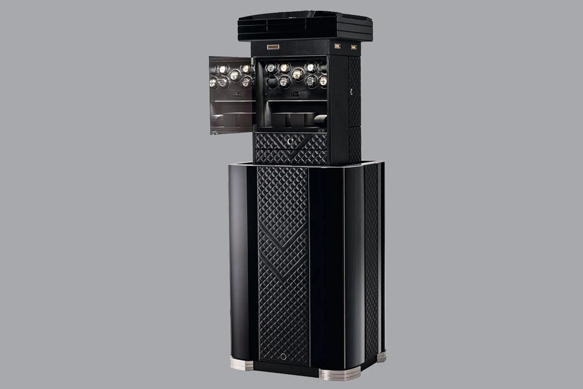 Choose from various materials, such as high gloss lacquer, leather, hand-polished stainless steel and gold, to customise the unit, which can store up to 18 watches. There are also two front and side drawers to store other valuables.