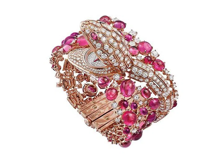 Of course, it wouldn’t be a Bvlgari collection without its emblematic snake making an appearance. The final piece is the Serpenti Misteriosi Riviera, a rose gold secret watch laced with rubellites and diamonds that appear to float, thanks to the fil couteau technique.