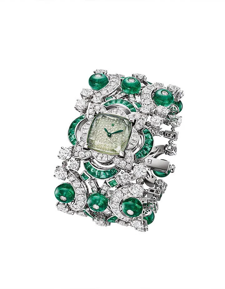In addition, like the necklace, the Blooming Beauty watch displays Colombian emeralds, Paraiba tourmalines, diamonds, and pink and purple spinels that appear to blossom around a snow-set diamond dial. A mint green tourmaline covers the delicate watch face.