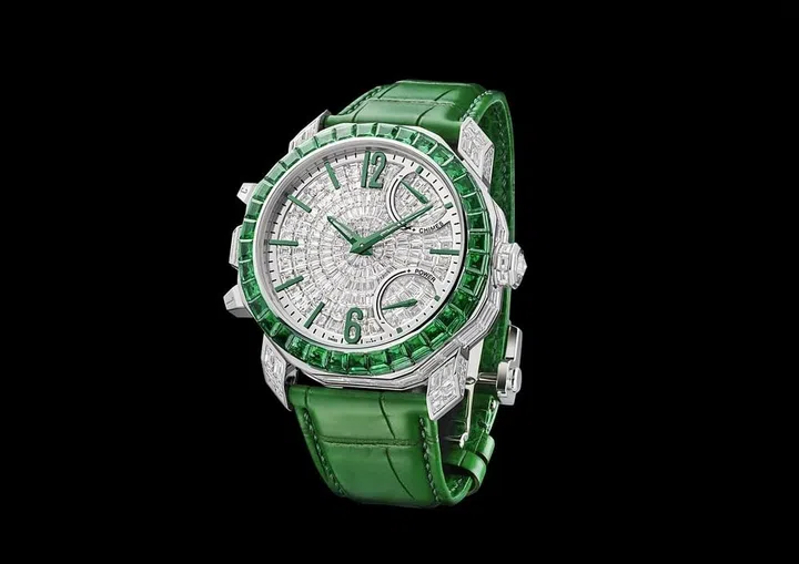 Following an earlier all-diamond version, the latest iteration comes in a 44mm white gold case and glitters with 446 baguette-cut Zambian emeralds and diamonds weighing more than 30 carats.