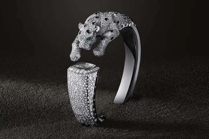 Upping the ante are two magnificent high jewellery interpretations that turn Panthere anatomy into precious wrist architecture, featuring a realistically rendered cat leaping towards a discreet diamond-set dial on a Toi et Moi-style bracelet. The polished yellow gold version, spotted with black lacquer, boasts a black lacquer dial with a diamond-paved bezel, while the full-diamond encrusted white gold piece comes adorned with onyx spots.
