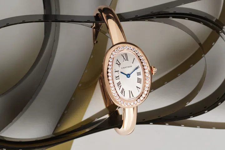 The Baignoire, named for its bathtub-like ellipse shape and curved crystal, remains one of Cartier’s most distinctive and diminutive expressions of feminine refinement. It now appears across a spectrum of personalities — from miniature lacquer-dial models on monochrome straps to more voluptuous gold bangles.