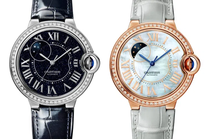 Recently expanded to heighten its sculptural presence, the collection boasts four new precious references, each exploring colour, light, or complication in its own way. The first is a 36mm Ballon Bleu Day/Night model, equipped with a crescent-shaped aperture at 10 o’clock that displays the passage from day to night. Available in white gold with an aventurine glass dial or pink gold with a mother-of-pearl dial surrounded by diamonds, it evokes celestial poetry beating to the rhythm of an automatic-winding movement.