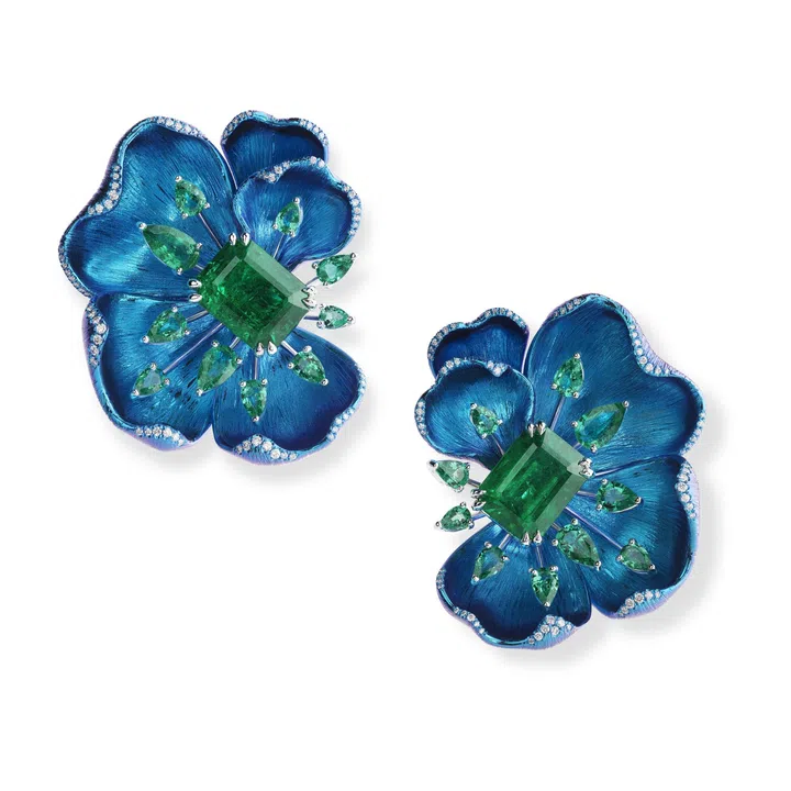 Chopard Insofu floral earrings in white gold, platinum, and titanium set with two emerald-cut emeralds totalling 11 carats, pear-shaped emeralds, and brilliant-cut diamonds
