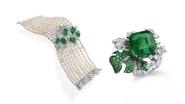 One standout is a set of four necklaces designed to be worn together or separately, offering endless styling possibilities. At its center is a diamond choker with a vibrant 2.50-carat square-cut emerald, complemented by a second necklace featuring a 15.53-carat octagonal emerald. A long necklace of emeralds, pearls, and diamonds adds fluidity, while a delicate sautoir of pink pearls provides an ethereal contrast.