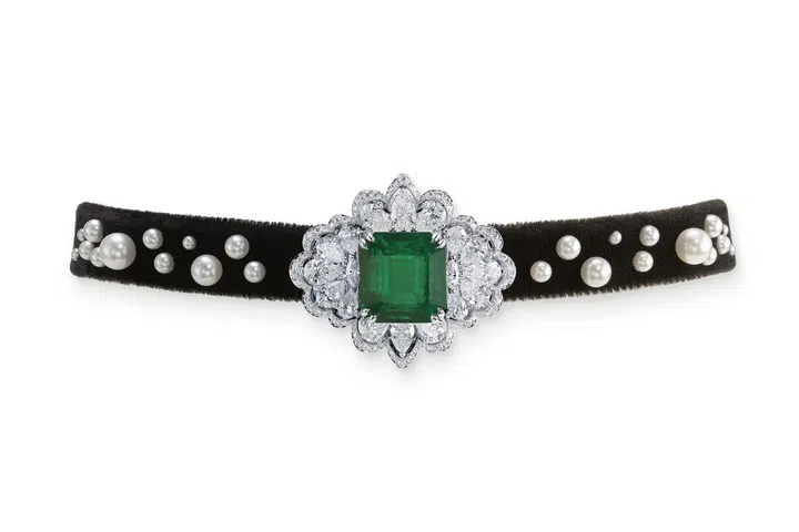 Among the various necklaces created from the Insofu Emerald is this choker with a 14.08-carat emerald and diamonds set on a velvet ribbon dotted with pearls