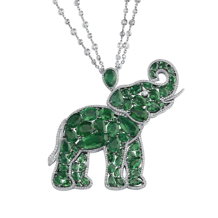 One showpiece is an elephant-shaped pendant, a tribute to the gem’s name. Featuring emeralds of various shapes and sizes, framed by shimmering diamonds that form the tusks, the pendant comes with a long chain, and is ingeniously designed to transform into a brooch. The pachyderm’s trunk, raised upward, symbolises prosperity and good fortune — a fitting emblem for a collection that embodies joie de vivre.