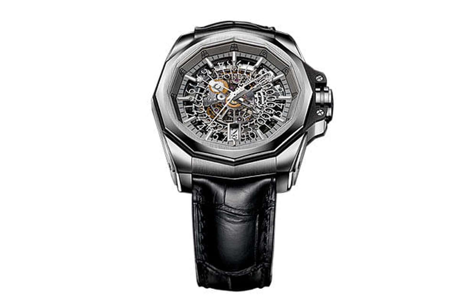 Don’t be overwhelmed by Corum’s Admiral’s Cup AC-One 45 Squelette. Impressively complicated as the dial may be, it’s still a simple enough three-hand model with date. It is in fact the dates that give this imposing 45mm watch such a mesmerising face. The entire rotating date disc has been skeletonised to show off each individual number, with the present date aligning vertically at a window at six o’clock. It’s still a classic Admiral’s Cup however, with its 12-sided case, nautical pennants and Corum key-shaped seconds hand. The automatic CO 082 movement beats at 4Hz and comes with a 42-hour power reserve.