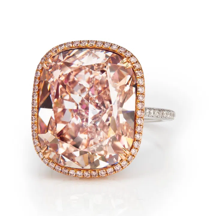 A large pink diamond, in Cushion Cut, is surrounded by a brilliant halo (Photo: M&B Private Jewelers)