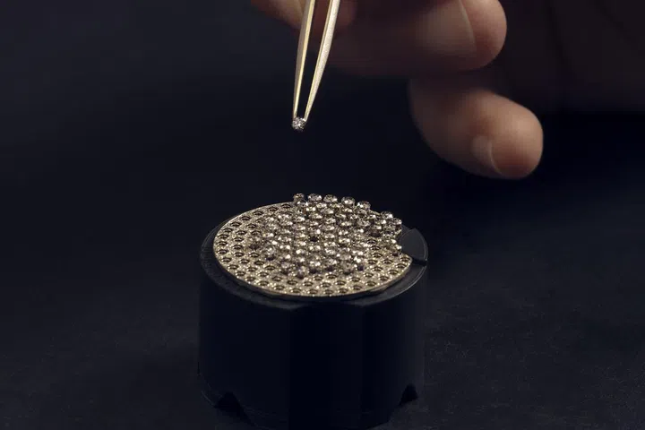 Once the shape is moulded, gem-setting is done by hand. And after marking the spaces where the stones can go, the holes for the gems are set. Glue is strictly forbidden in the process. Thus, with the utmost precision, the artisan carves grooves into the diamond to create a floating effect when attached to the watch. Some of the stones Cartier’s specialists work with measure a mere 0.6mm in diameter.