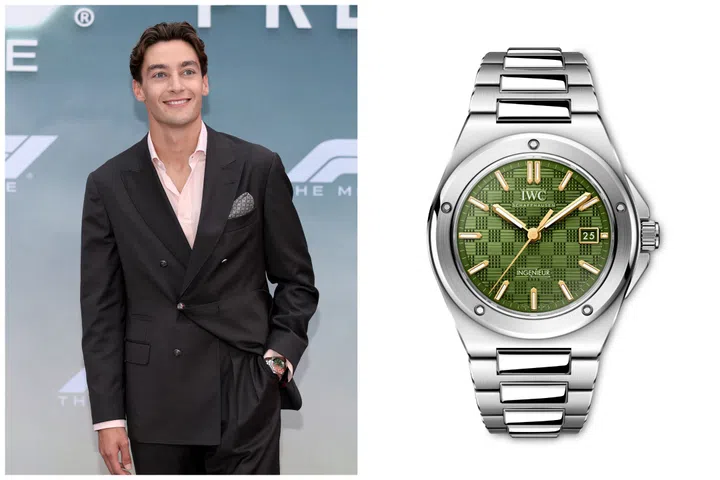 IWC brand ambassador George Russell was spotted at the world premiere of F1 The Movie with an IWC Ingenieur Automatic 40 Ref. IW328908, which is inspired by the custom-made model worn by Brad Pitt’s character in the movie