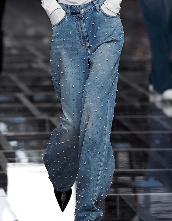 Thankfully, designers have a lot more to offer than just your regular blues. Paying tribute to the late Hubert de Givenchy’s “sense of practical ornamentation” (as described by the press notes for the collection), Givenchy creative director Matthew M. Williams played with elements from its haute-couture heritage, leading to pieces such as super-soft, worn denim studded with pearls.