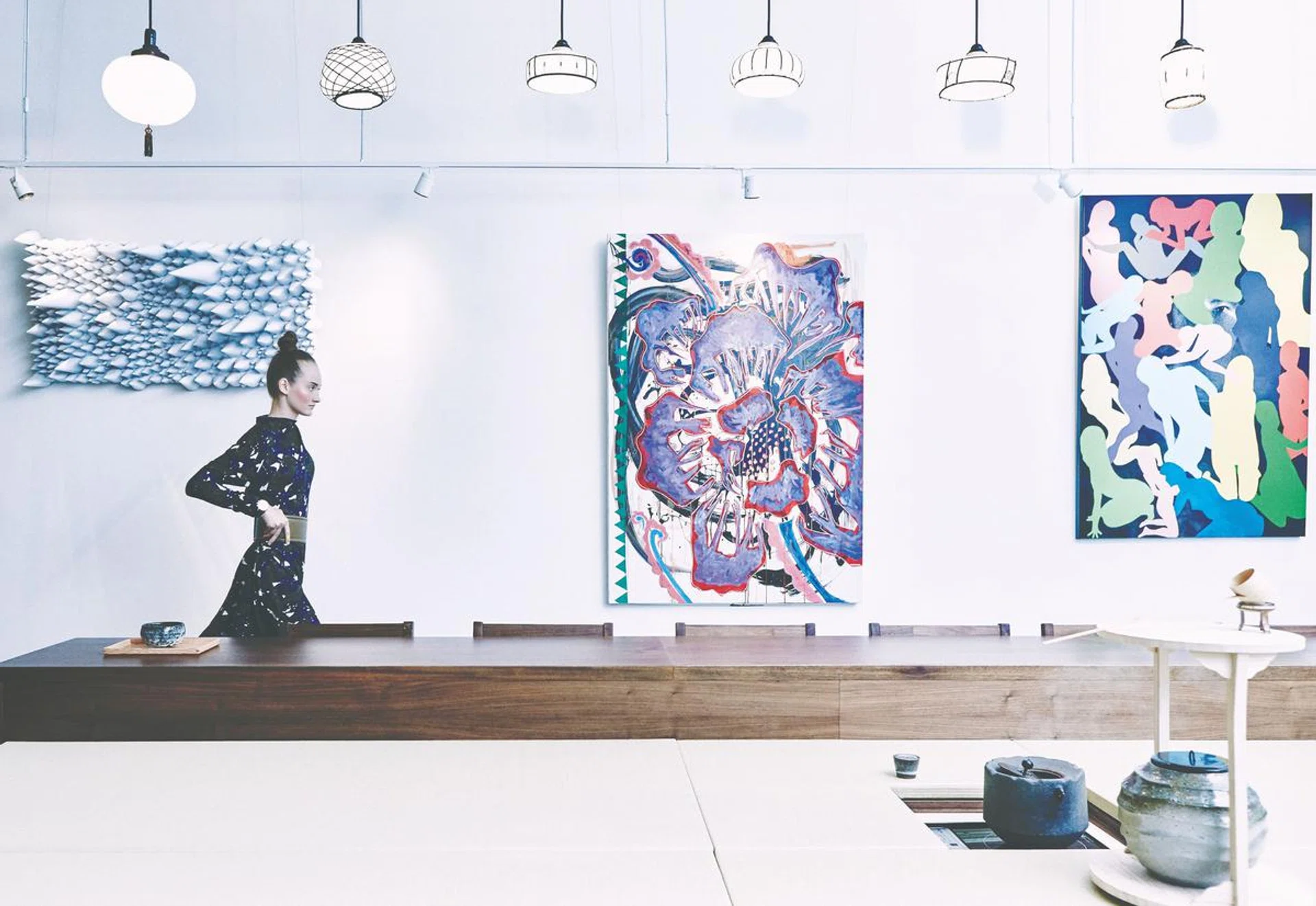 Earthy, wooden tones and the neutral colour palette at Hashida Garo are interrupted only by the abstractionisms (pictured on preceding pages) of chef-owner Kenjiro Hashida. Named after the Japanese word garou or gallery, the exhibition space may be used by budding artists for free; Hashida having once been a cash-strapped, aspiring painter himself. The modern Japanese tea room is centred around an elevated hearth – a stage for the tea master to make his brew in view of guests. Complementing the elegant brews are a mix of traditional Japanese desserts and new creations such as a kaya and bean-paste monaka.