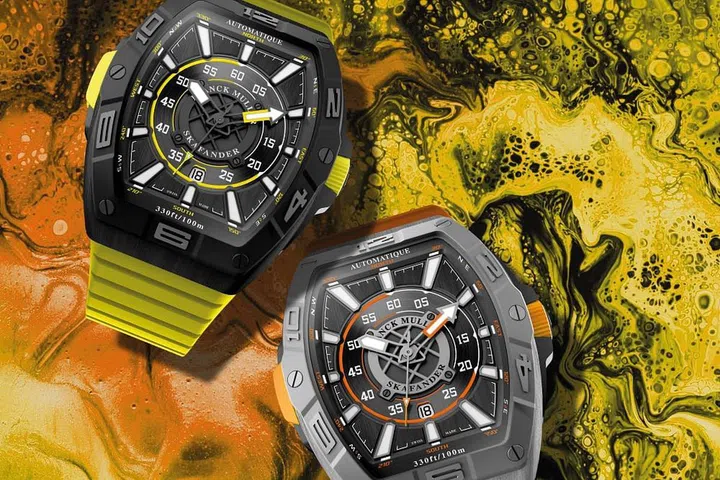 A variety of colour options, from yellow to orange, is available in the new Skafander 43 collection. (Photo: Franck Muller)