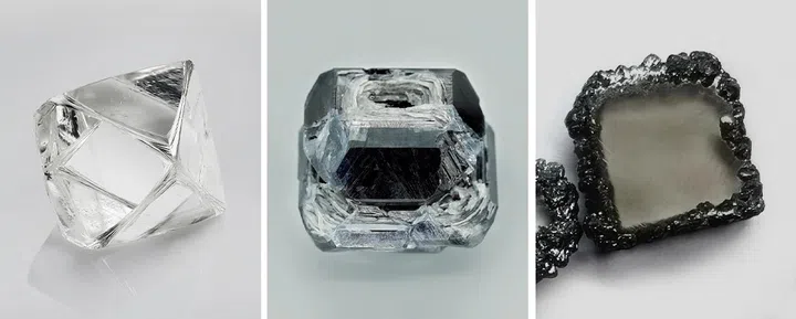 From left to right: natural diamond rough, lab-grown diamond rough made by the HPHT method, and lab-grown diamond rough produced using the CVD method.
