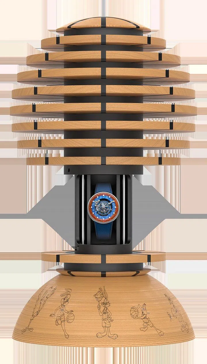 We’re referring, of course, to Kross Studio’s fancy wood and aluminum display case that’s part design piece, part storage unit. Again, the Looney Tunes basketball crew returns etched on the sculpture’s wooden stand; the sculpture’s upper basketball-esque half can be lifted to store your watch within.