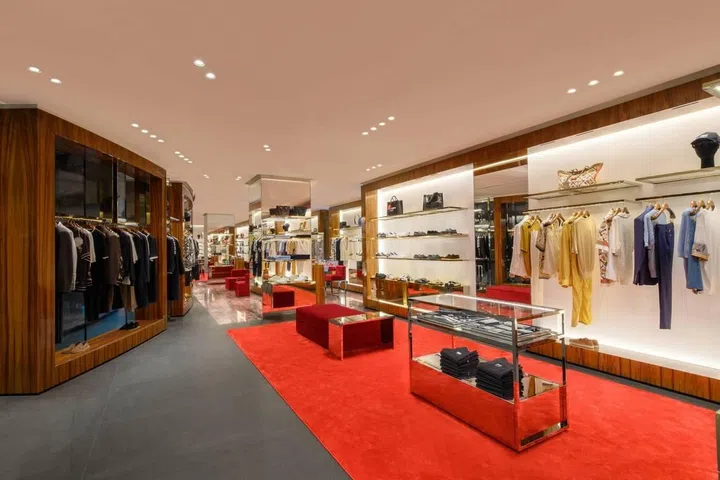 Red gum wood walls, Basaltina stone floors, and sequoia red marble accents set a lavish tone, enhanced by velvet seating and warm lighting. The single-level layout flows smoothly through women’s and men’s ready-to-wear, jewellery, accessories, and home pieces. Every material choice reinforces the brand’s bold visual identity.
