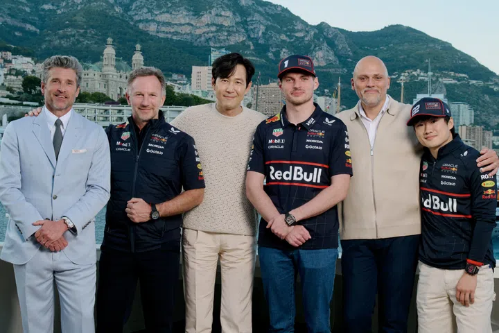 Oracle Red Bull Racing drivers Max Verstappen and Yuki Tsunoda recently in Monaco with actors Lee Jung-jae, Patrick Dempsey, and TAG Heuer CEO Antoine Pin